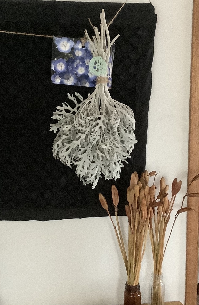 とりあえず長い枝のシロタエギクだけまとめてスワッグにしました。